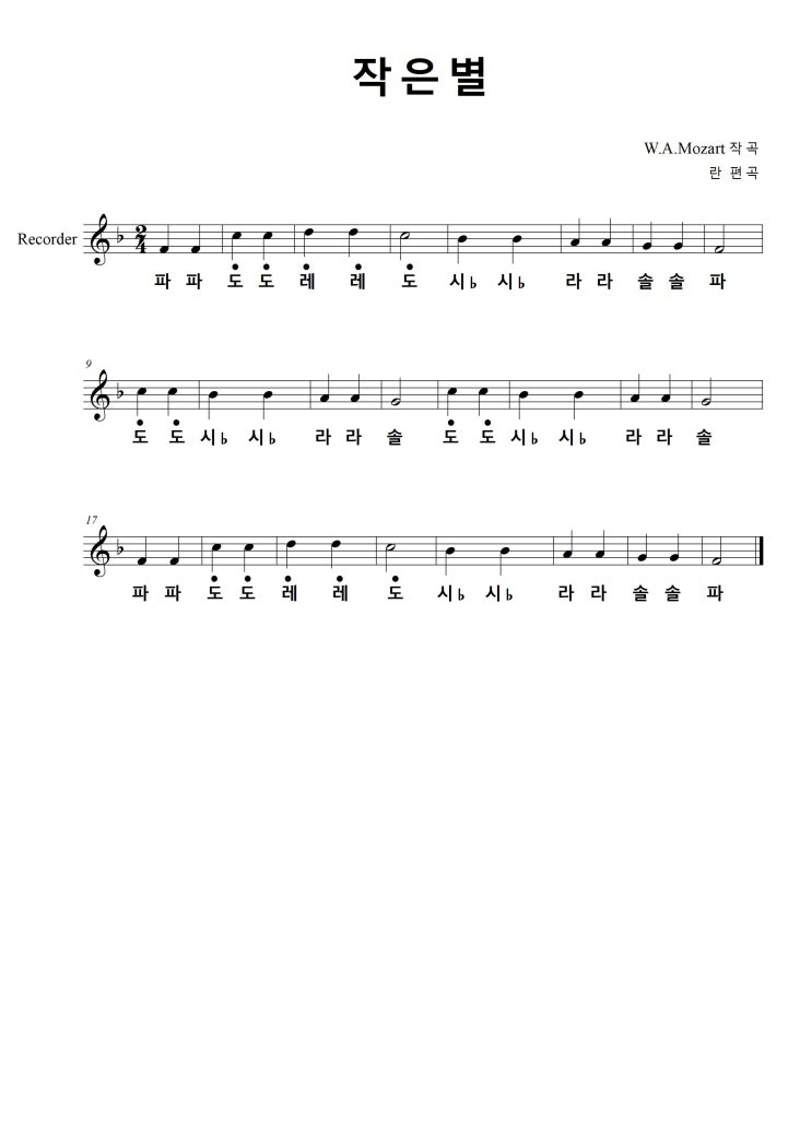 작은별 리코더 바장조(F Major) 악보와 음원