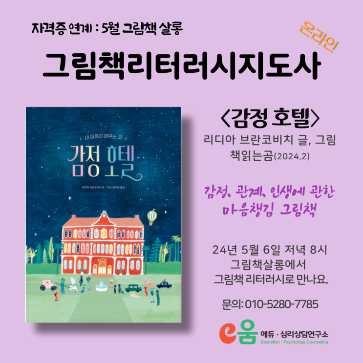[24년 5월 그림책살롱 안내] 다양한 감정, 관계, 인생에 관한 그림책 <감정 호텔>(5/6 pm 8시) 온라인: 그림책살롱+그림책리터러시지도사 자격 취득 가능