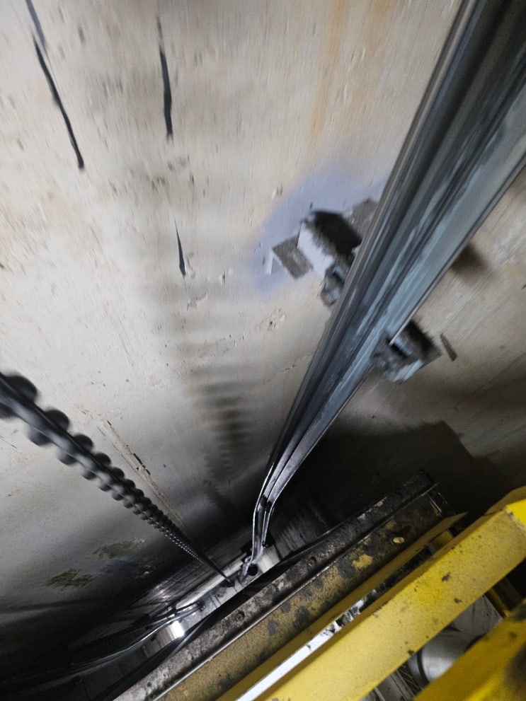 카운터레일이 엿가락처럼 휘어졌습니다.원인이 건물이 줄어들었다는데 100mm정도.. #중랑구엘리베이터 #면...