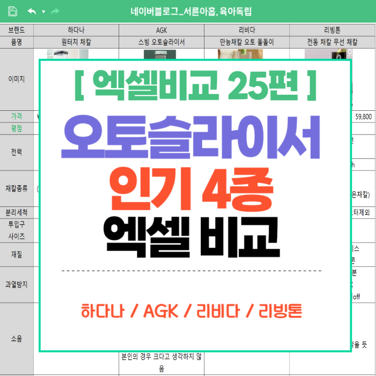 [엑셀비교 25편] 오토슬라이서 자동채칼 인기 4종 스펙 정리