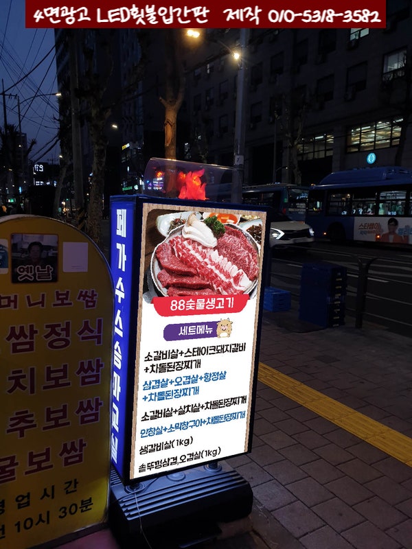 숯불갈비집 치킨집 양꼬치집의 최상 홍보입간판 4면LED불빛조명횟불입간판