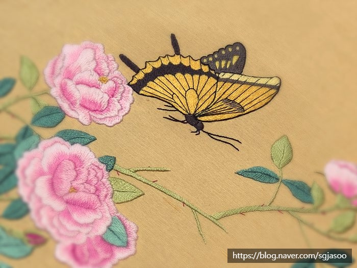 (수강생작품) 화접도 장미꽃 나비 그림 /전통자수 궁중자수 한국자수 동양자수 부산 김해 양산