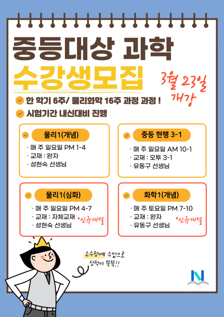 [엔에스과학수학] 중등 대상 물리1(심화)·화학1(개념) 개강 안내