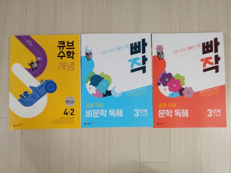 겨울방학과 학기중 진행 교재로 동아출판의 큐브수학 개념 4-2와 빠작 문학/비문학 독해 3단계를 선택해 함...