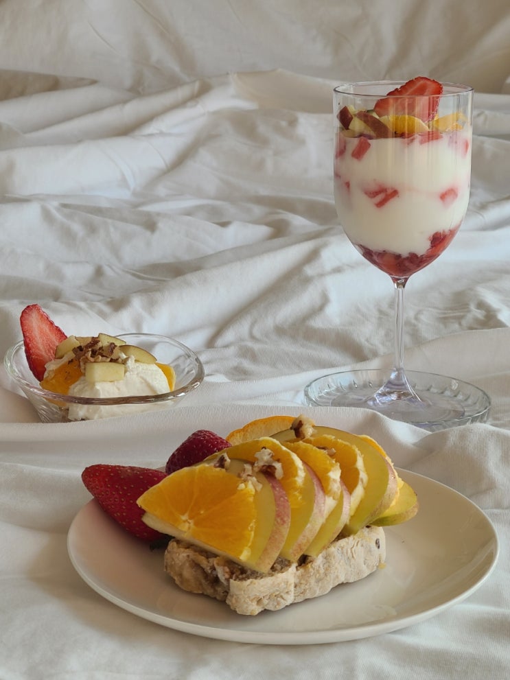 메인은 오렌지사과를 슬라이스해서 올린 통밀빵이다. 인스타에서 식빵에 사과를 슬라이스해서 가염버터를 ...