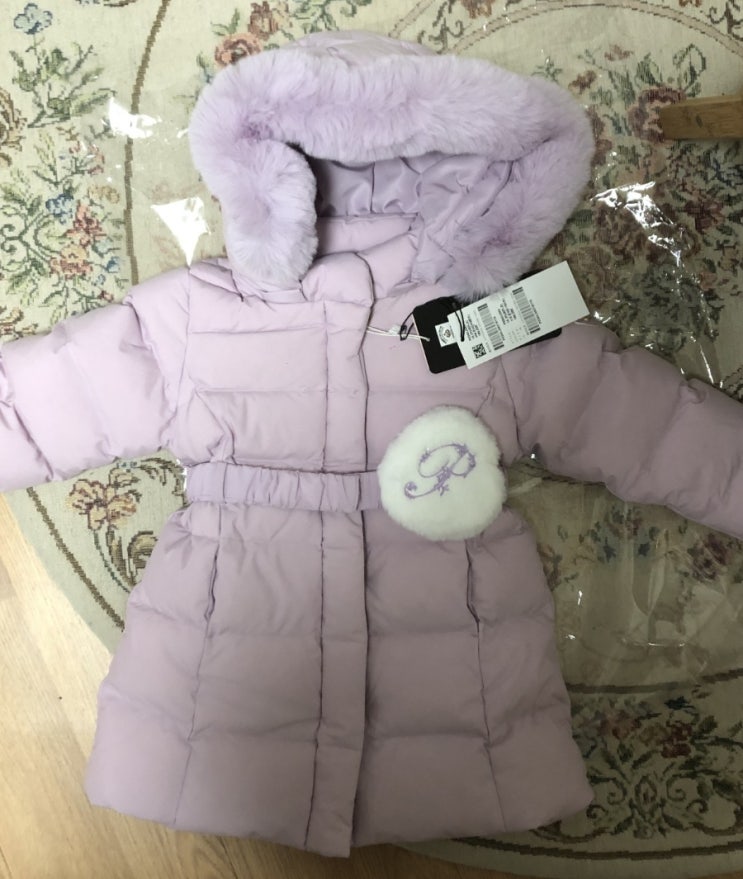 엄마가 선물해주신 애기패딩 연보라색이 넘 예쁘다. 하얀 동그라미 주머니는 포인트! 똑딱이도있어 편리하...