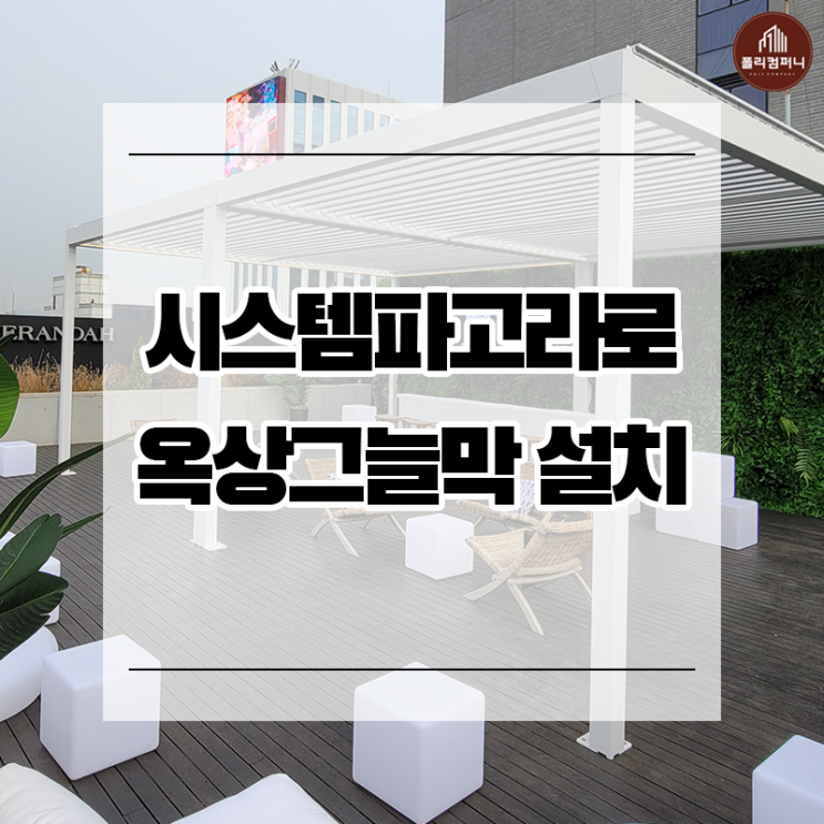 안녕하세요~ 폴리컴퍼니입니다! 오늘은 시스템 파고라 시공 현장인데요, 옥상 그늘막 용도로 설치를 진행했...