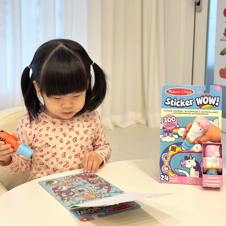 오늘은 스티커 붙이기 놀이를 유독 좋아하는 꼬미를 위해 스티커북을 준비해 줬어요 아기 소근육 발달에 좋...