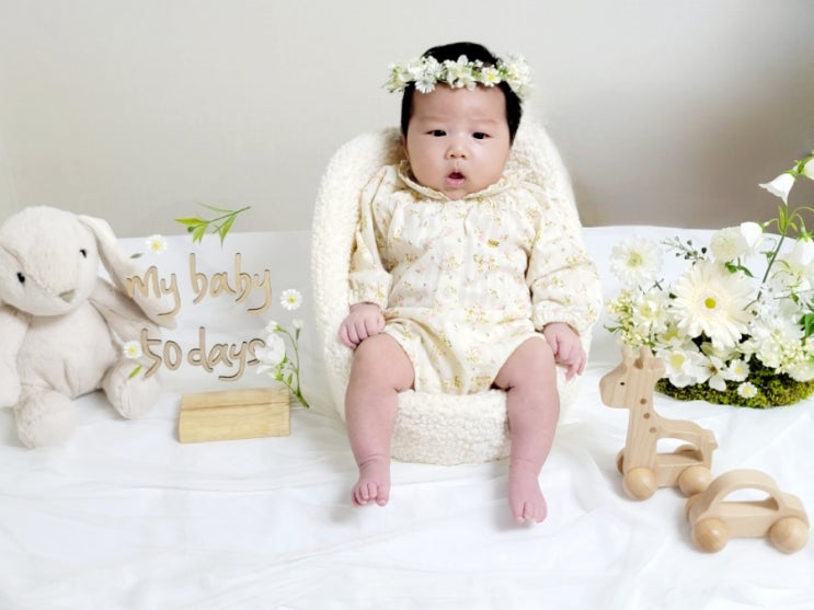 아가의 50일 모습을 스튜디오에서 예쁘게 찍어주고 싶었지만 다 찍어주기에는 비용이 비싸고 외출이 쉽지가...