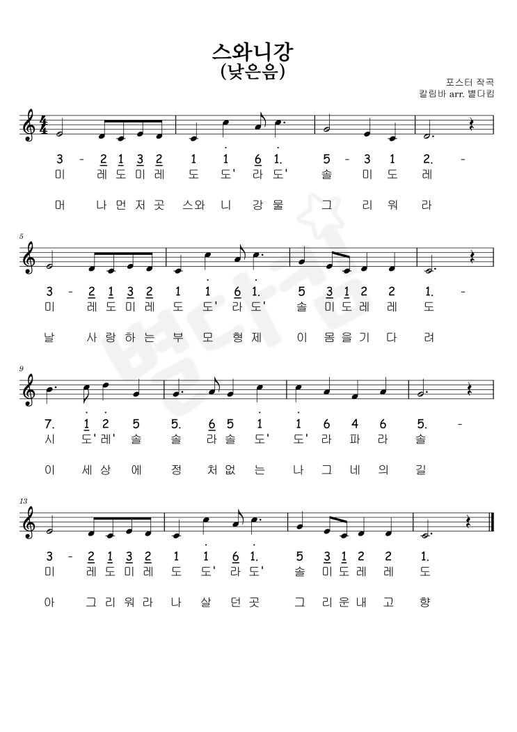 칼림바 악보, 스와니강 칼림바 악보, 쉬운 칼림바 악보