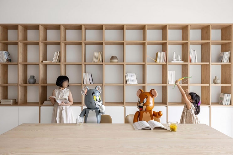 가장 행복한 힘으로 가족이 모이는 장소. 조용한 시간에 함께 책을 읽는 평온함. 거실전면책장을 배치하여 ...