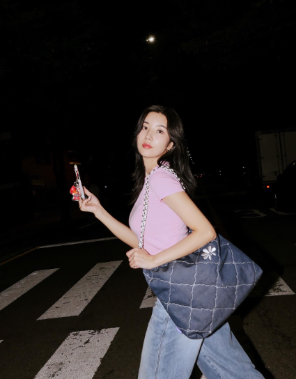 권은비 여자 청청 패션 대학생 쇼퍼백 추천 아이템으로 완성