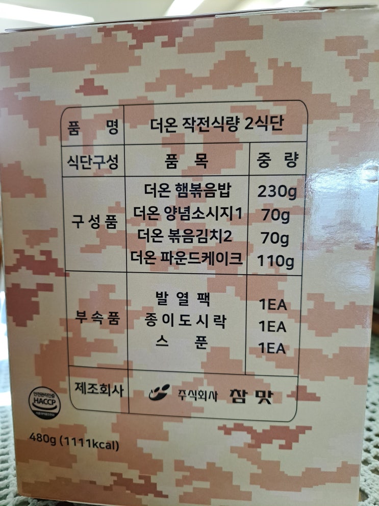 얼마전 아들이 예비군훈련에서 받아온 전투식량을 먹어보았어요 박스안에 이렇게 들어있구요, 디저트까지있...
