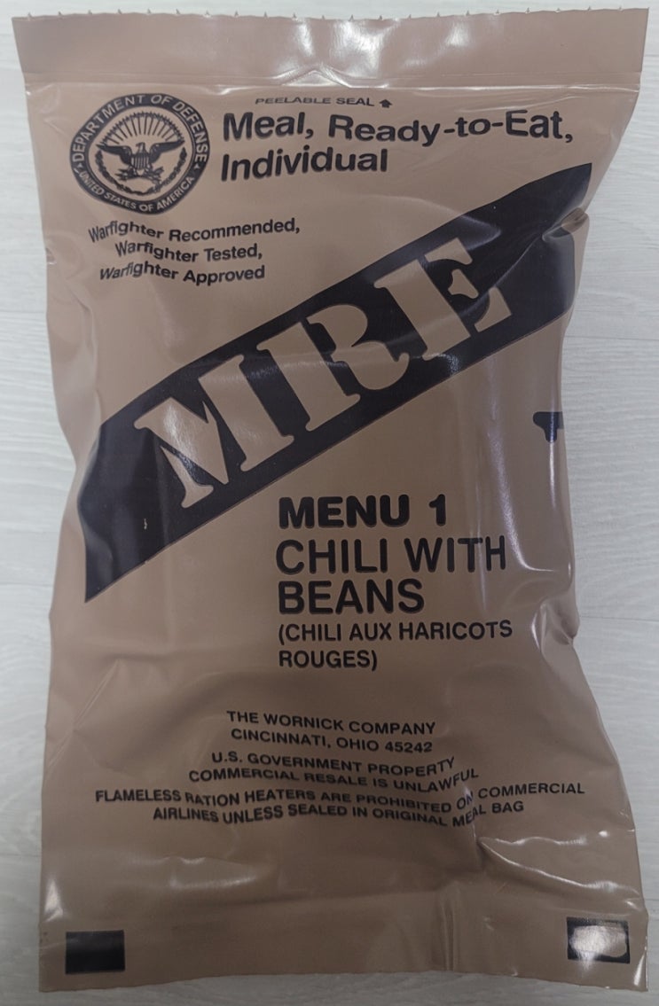 미군 전투식량 MRE 메뉴 1번 CHILI WITH BEANS 콩을 넣은 칠리인가요? 상단을 좌우로 당...