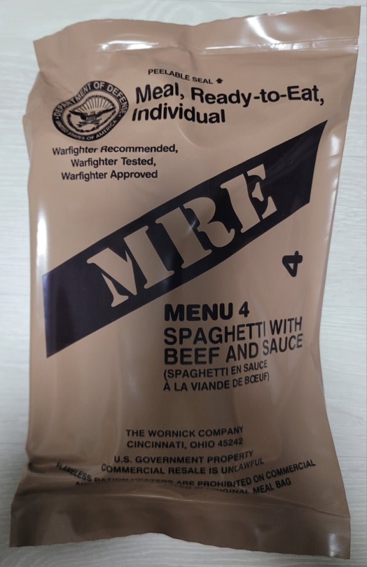 미군 전투식량 MRE 메뉴 4번입니다 SPAGHETTI WITH BEEF AND SAUCE 상단을 좌...