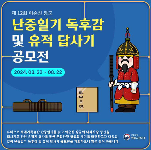 제12회 이순신 장군 난중일기 독후감 및 유적 답사기 공모전 1. 공모전 개요 주 최 : 문화재청 현충사관리...