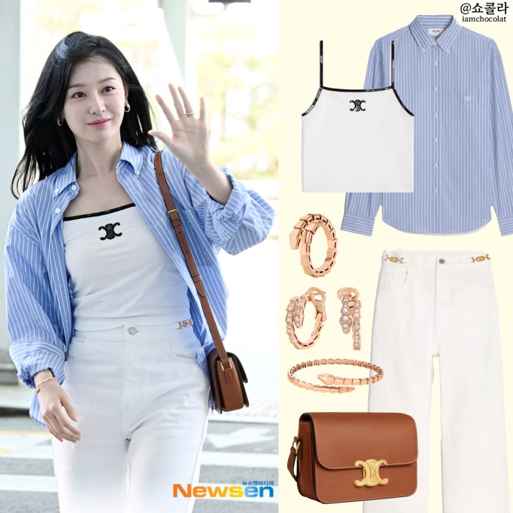 김지원 공항룩 셀린느 블루 셔츠 트리오페 가방으로 여신 등극