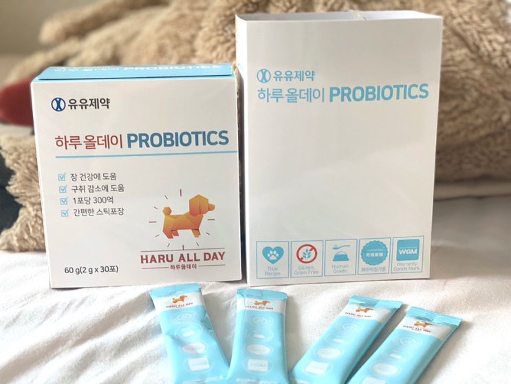 안녕하세요 오늘은 유유제약에서 나온 하루올데이 강아지유산균, 편안한 분말스틱포장으로 처음부터 끝까지...