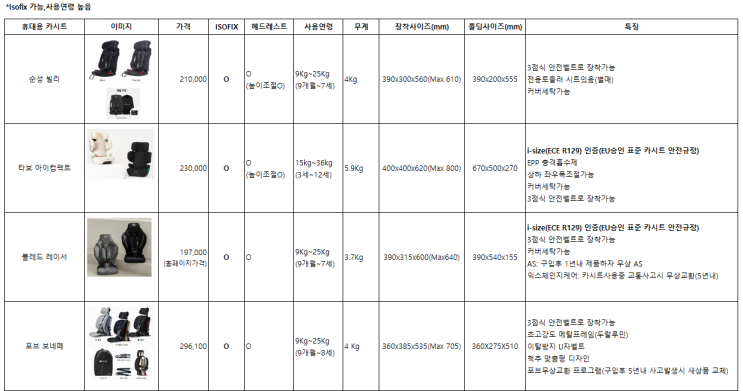 휴대용카시트 구입검토(6제품)