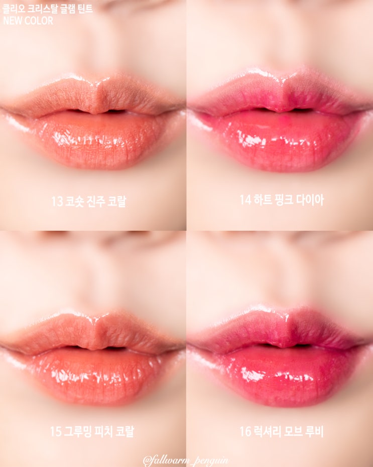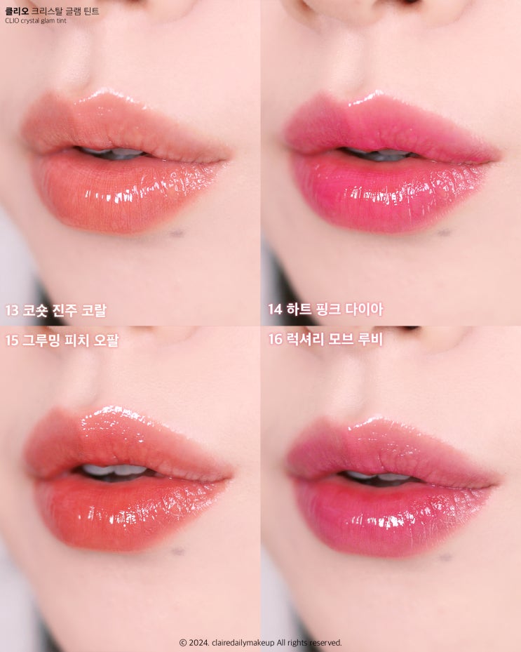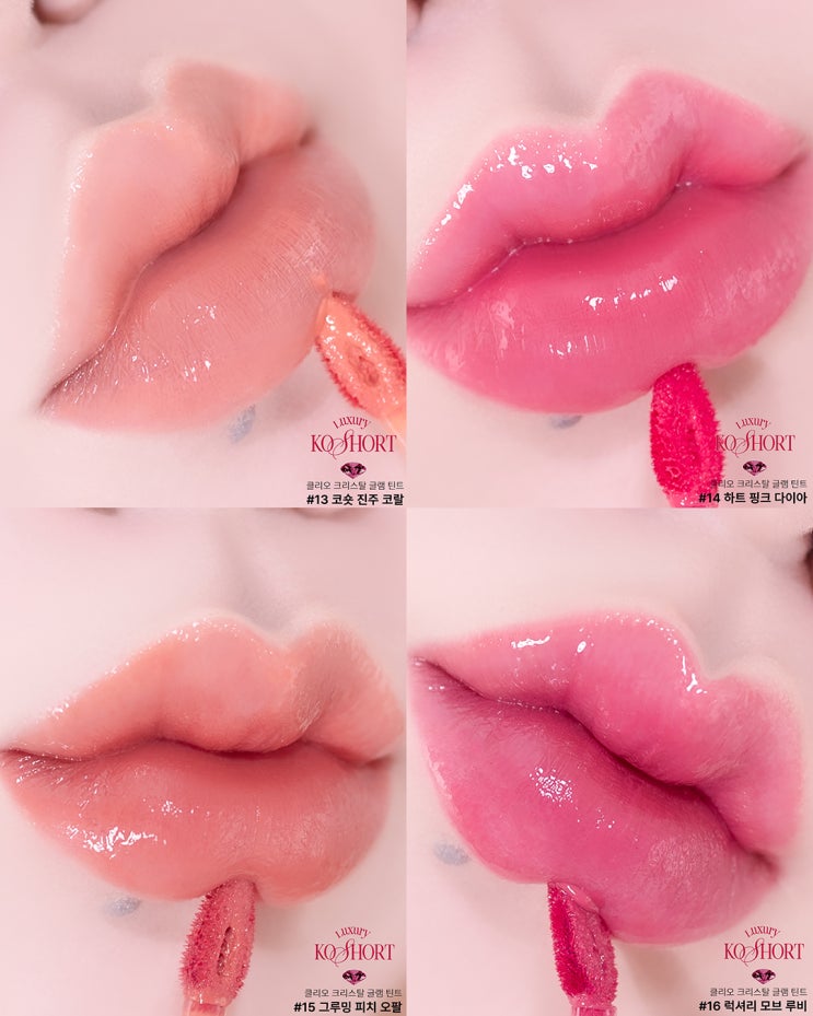 립 틴트 클리오 냥생역전 크리스탈 글램 틴트 13호 코숏 진주 코랄 14호 하트 핑크 다이아 15호 그루밍 피치 오팔 16호 럭셔리 모브 핑크