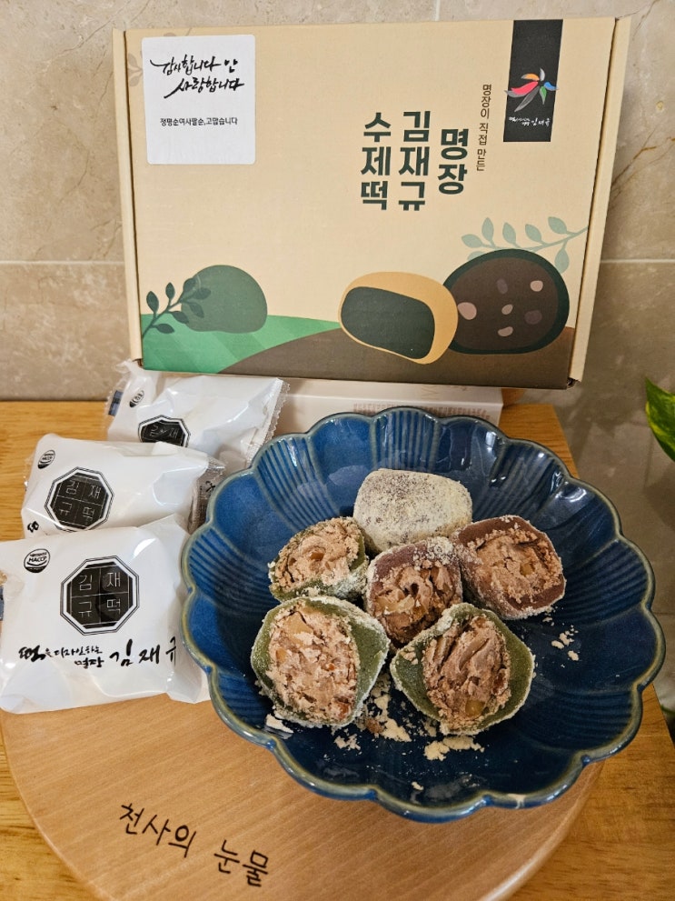 안녕하세요. 저번주 친구 어머니 팔순잔치에서 답례품 선물로 받은 명장 김재규 수제떡이예요. 처음 먹어보...