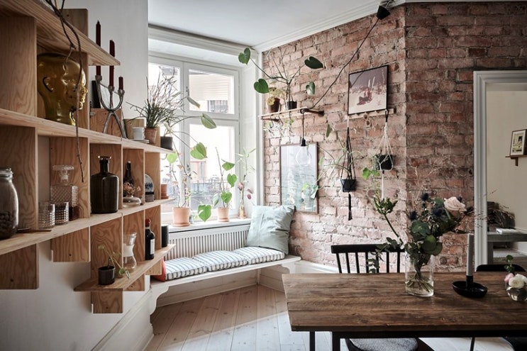 인테리어선반 원목벽선반 창가 벤치의자와 파벽돌 시공 아늑한 공간 엿보기