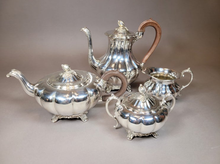 앤틱 올드 잉글리시 멜론 커뮤니티 실버 플레이트 커피팟 티팟 슈가볼 크리머 4개 세트에요 화형쉐잎에 뚜...