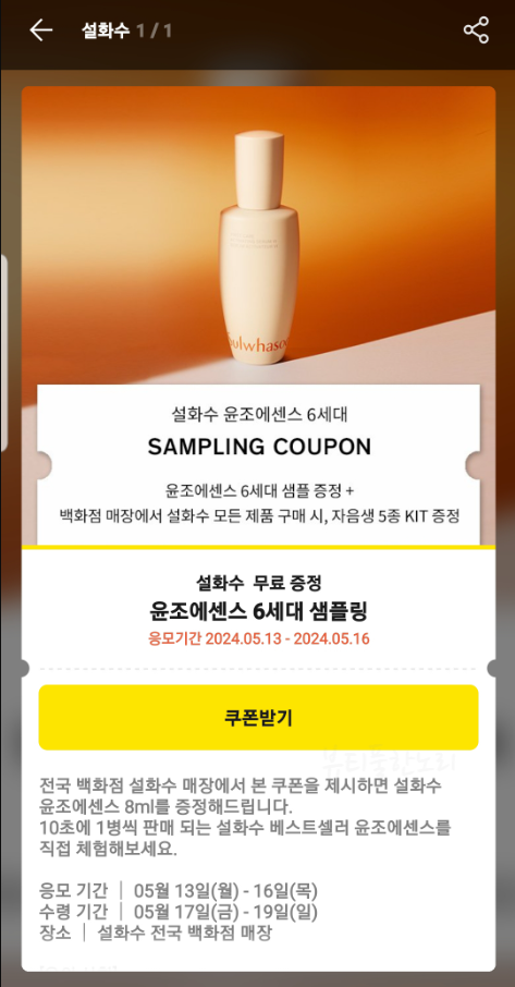 ➡️매장 수령 기간 5월 17일 ~ 5월 19일 일요일까지 16일 목요일까지 쿠폰 내려받기! 마실가실 분 가서 받아오세여 ㅋ이번 주 주말까지!! 설화수 윤조에센스 8ml 증정 (˵⚈ε⚈˵)