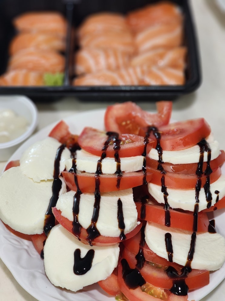 트레이더스 모짜렐라 치즈로 간단 카프레제 만들기 덩어리진걸 좋아하지만 이번엔 간단하게 슬라이스된걸로...