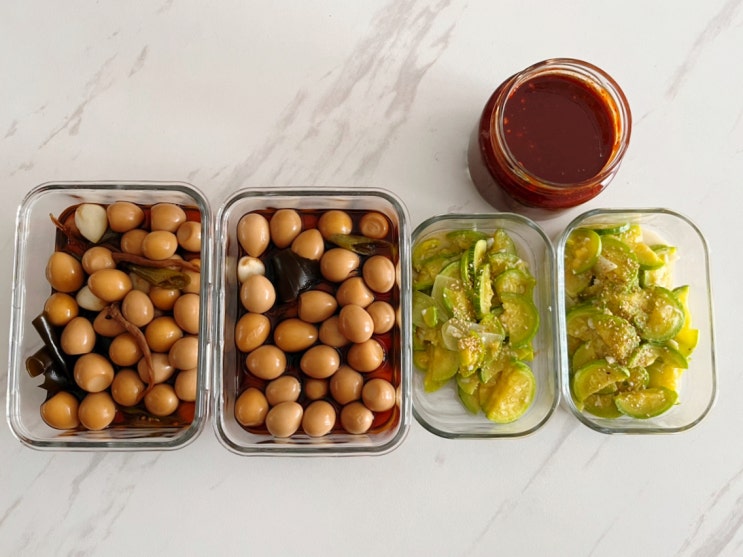 냉파집밥. 애호박볶음, 메추리알장조림, 순대국밥;