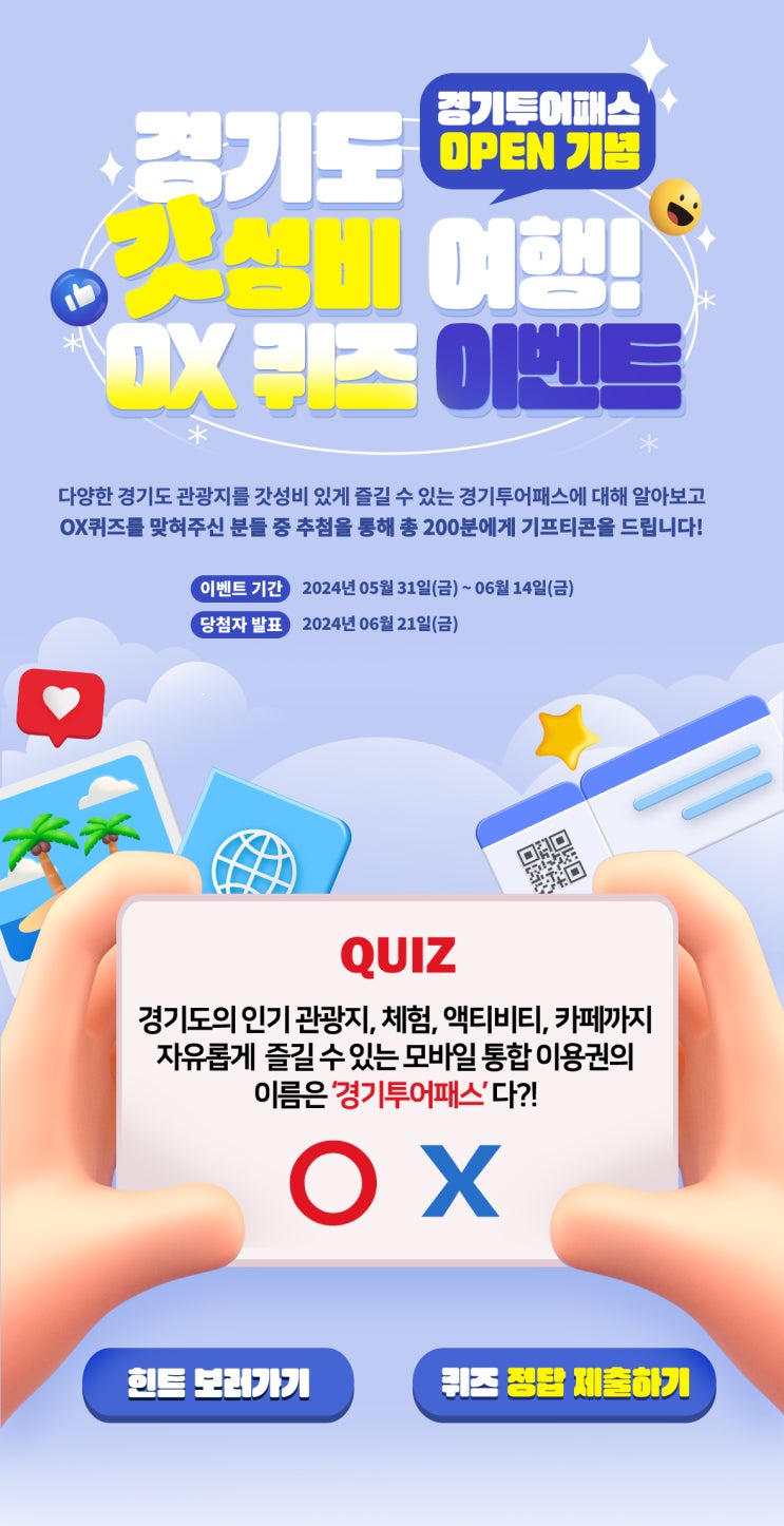 경기도 갓성비 여행 경기투어패스 오픈기념 OX퀴즈 이벤트 (치킨 & CU 모바일 5000원 상품권 기프티콘)