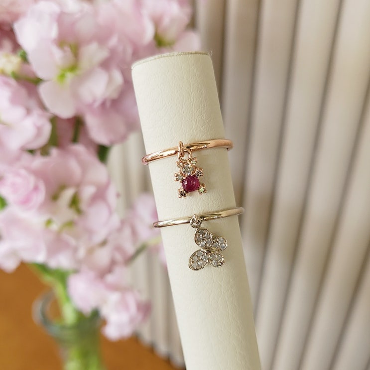 [ 마이샬롯 주얼리 ] 루비 곰돌이 & 그레이 다이아 나비 딸랑이 반지 14K 18K 골드