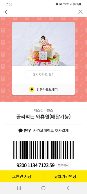 카카오기프티콘 베스킨라빈스 배달 해피오더로 쉽게