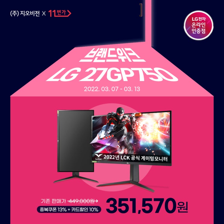 안녕하세요 여러분! 오늘은 11번가에서 진행하는 브랜드위크 행사에 LCK 공식 게이밍 모니터 '27G...