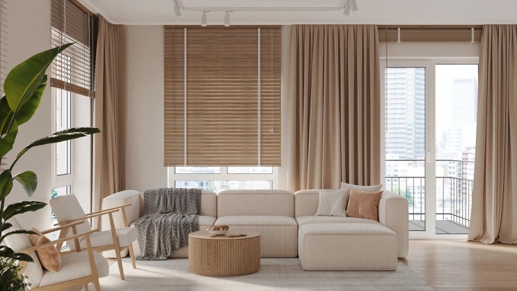 아파트 거실 우드 블라인드 모듈소파 템바보드 테이블 웜톤 아파트 원목 인테리어