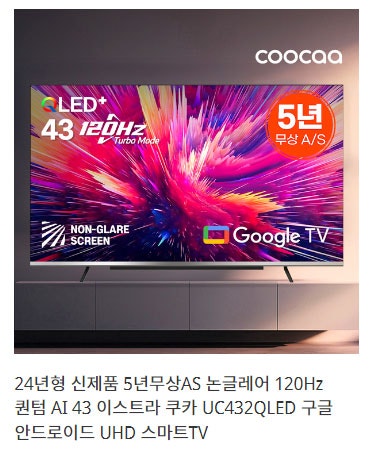 24년형 신제품 5년 무상 AS 논글레어 120Hz 퀀텀 AI 43 쿠카 UC432QLED 구글 스마트 TV