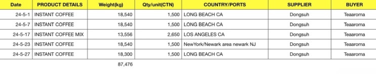 5월, 6월 수출 물량을 확인해 봤다. 우선 5월 물량 수출 횟수는 5회로 총 물량은 약 87톤이다. 특이할 만한...
