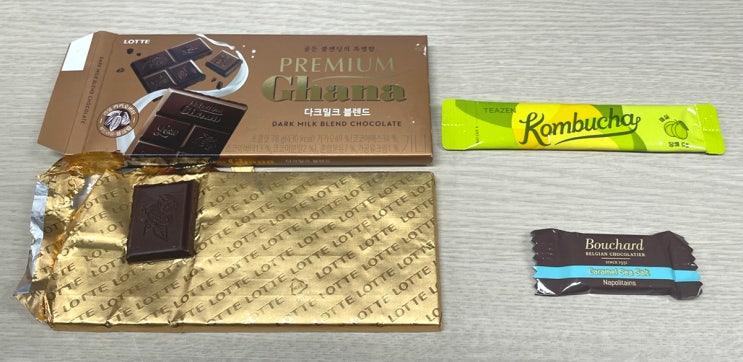 요즘 간식 : 롯데 가나 다크밀크 블렌드, 티젠 콤부차 매실맛, Bouchard(부샤드) 초콜릿 카라멜 씨솔트