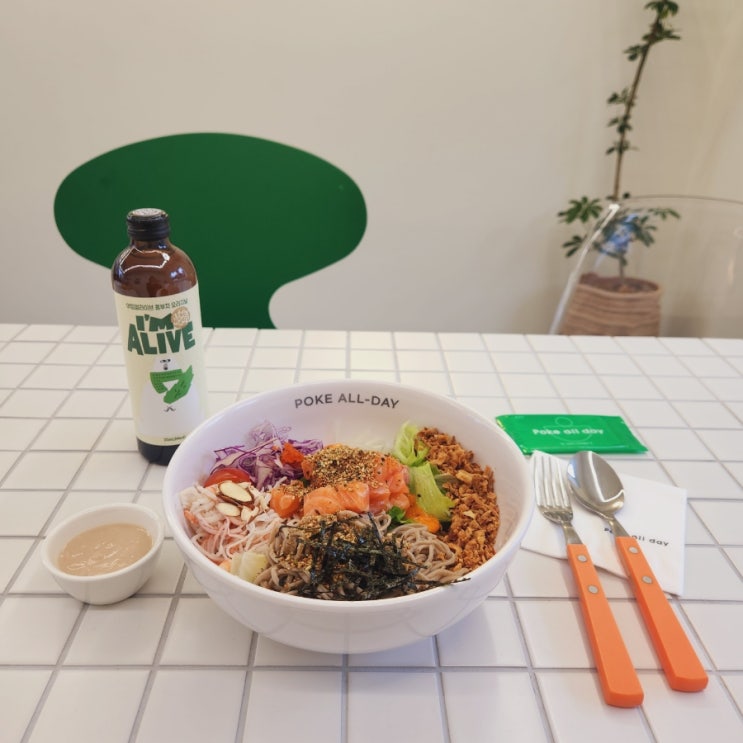 포케올데이 칼로리 확인 후 주문한 연어 메밀면 조합