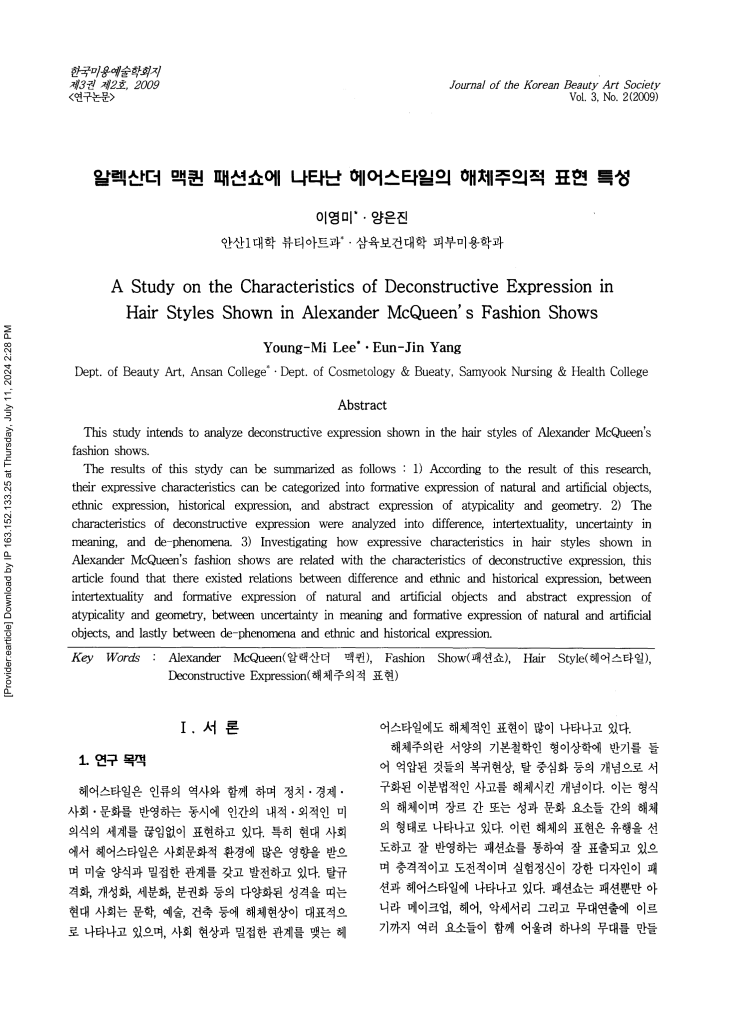 이명미·양은진, 「알렉산더 맥퀸 패션쇼에 나타난 헤어스타일의 해체주의적 표현 특성」 (2009)
