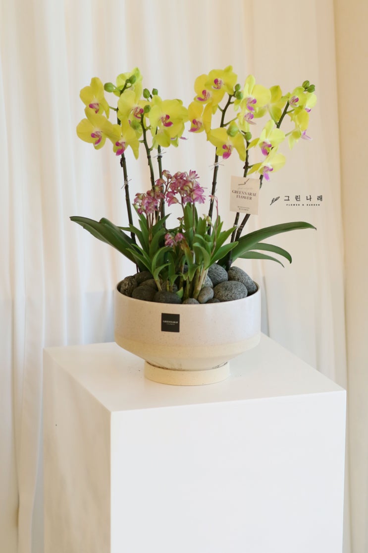역삼동꽃집 피누스플라워에 취임 축하 서양란을 주문해주신 고객님을위해 노란색과 핑크색의 오묘한 색상의...