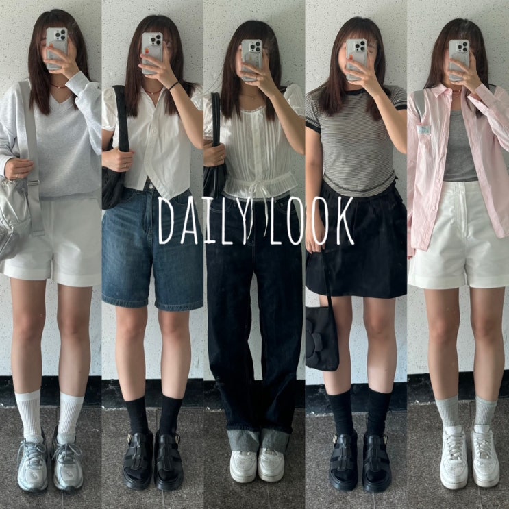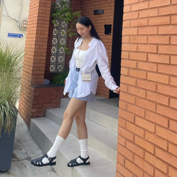 [6월 OOTD 여름 데일리룩] 몽돌반바지 | 로라로라블라우스 | 마크모크피셔맨샌들 | 파르티멘토반팔 | 시스루양말코디 | 버뮤다팬츠코디 | 실버백팩 | 미스치프크롭티 | 시눈셔츠