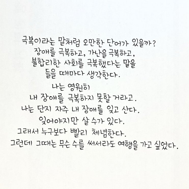 ‘극복'이라는 말처럼 오만한 단어가 있을까? 장애를 극복하고, 가난을 극복하고, 불합리한 사회를 극...
