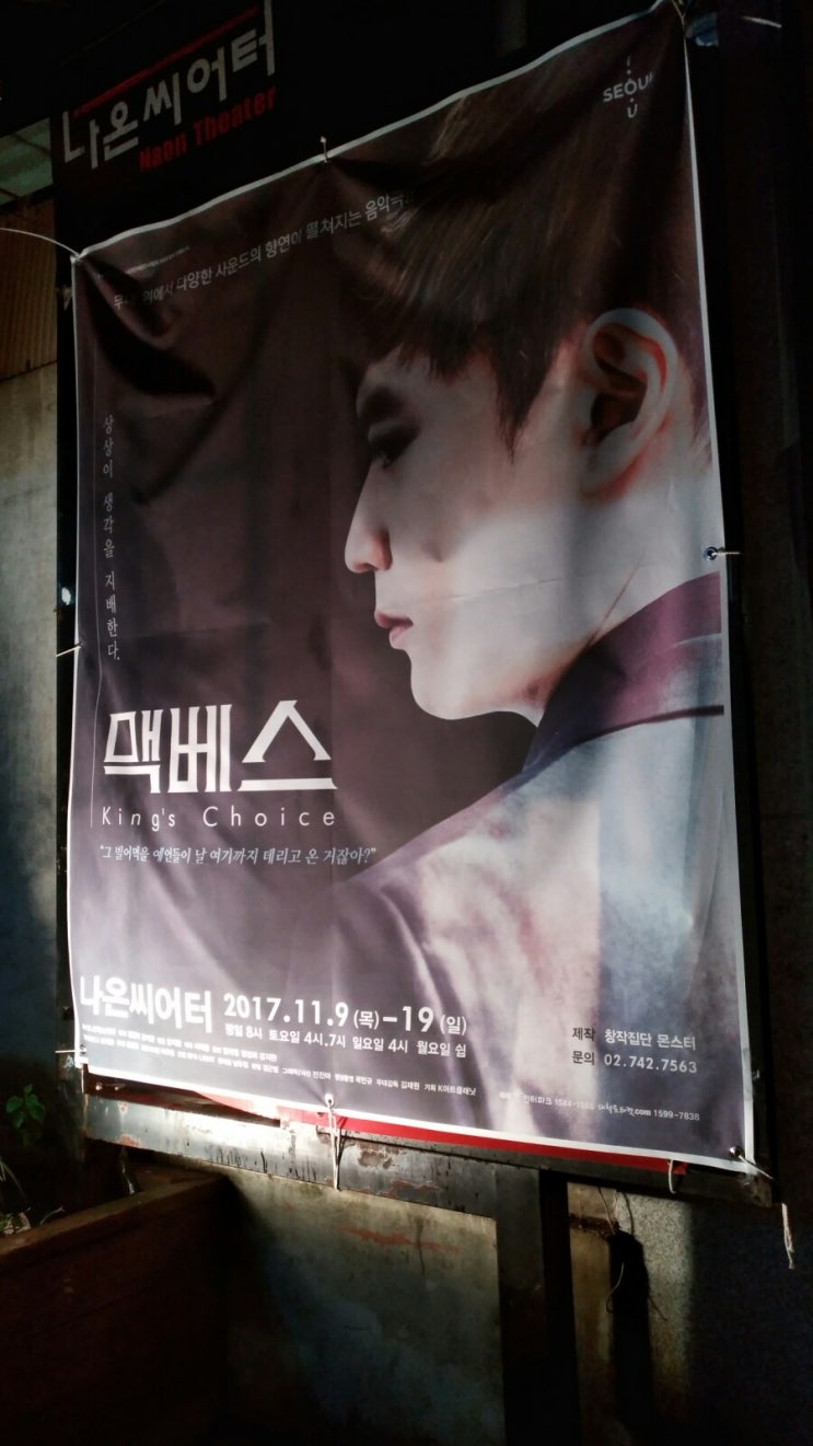 * 공 연 명 : 멕베스 * 관람날짜 : 2017. 11. 10. 금 20:00 * 주연배우 : 멕베스 - 정재원 레이디 멕베스 -...