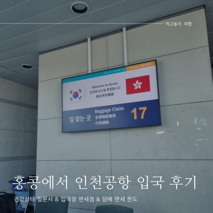 홍콩->인천공항 입국 후기 건강상태 질문서 입국장 면세점 홍콩 기념품 담배 면세한도 안녕하세요!옹결...