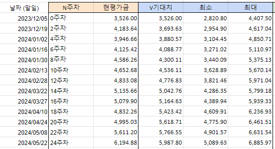 VR 라오어님의 TQQQ VR을 내 상황에 맞게 살짝 변형 20주 차->24주 차 매수 매도 발생 없음. 2022년부터 물려있던 것이 드디어. 드디어.... 이익으로 전환되었다. TQQQ 만세. 자산배