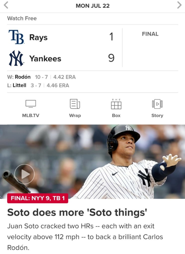 [뉴욕 양키스] 소토 홈런 두 방등 대포 네 번 쏴서 탬파베이와 4연전 2승씩 나눠 가짐(로돈 마침내 시즌 10승)