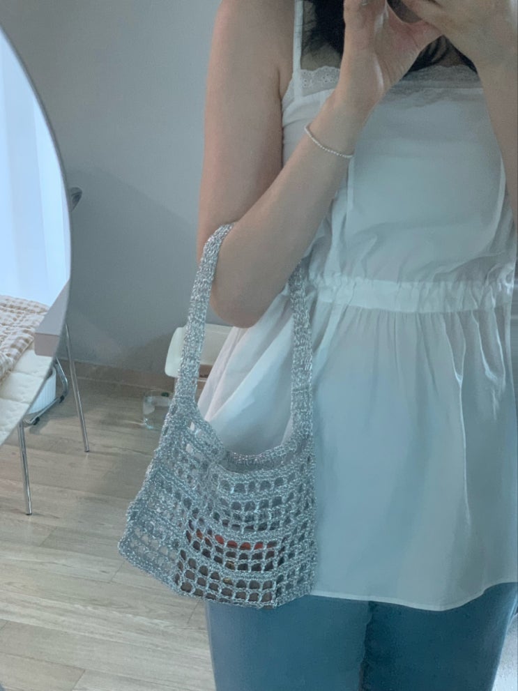매료되었습니다. 인스타에서,,, 너무 더운 여름 씌원해보이는 #실버네트백 예뻐보였거든요 번쩍번쩍,, 광나...