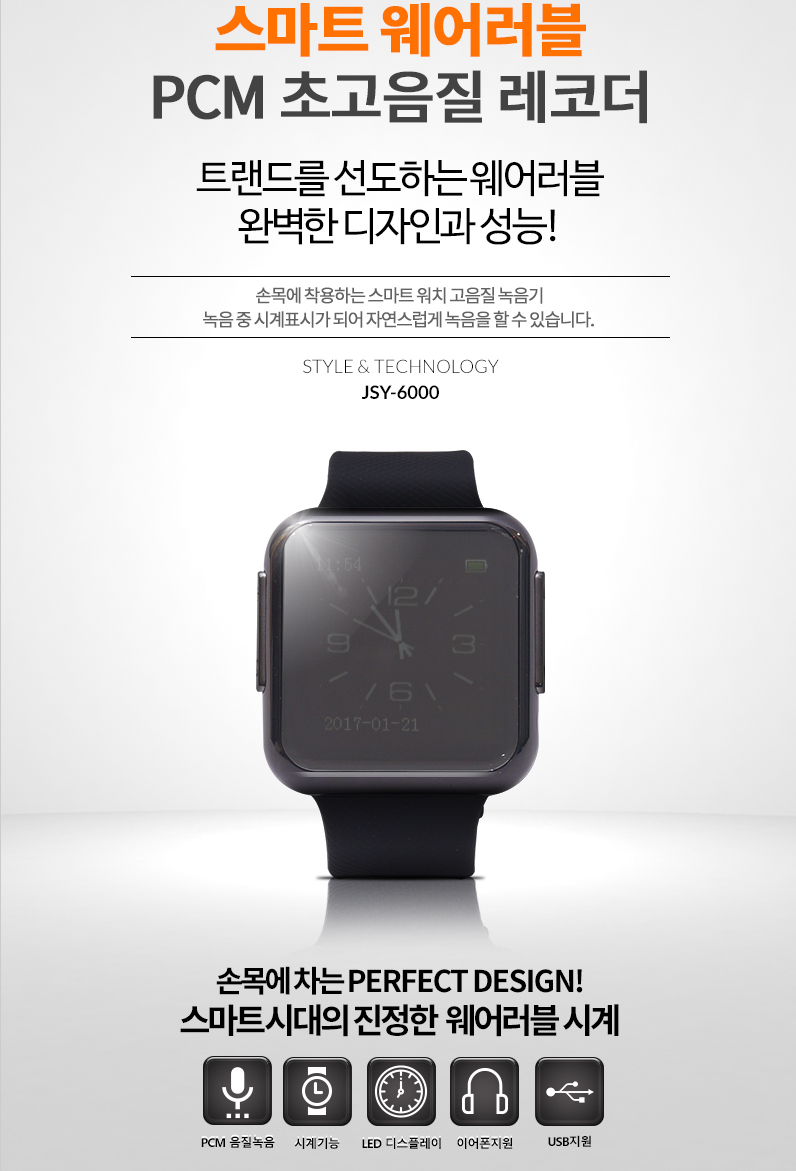 시계형녹음기 jsy-6000 트랜드에 맞는 웨이러블 스타일의 디자인을 채택하여 보다 세련된 느낌의 새로운 시계형녹음기를 선보이고 있습니다. 원음 그대로 녹음하는 pcm방식을 채택한 고음질의 보