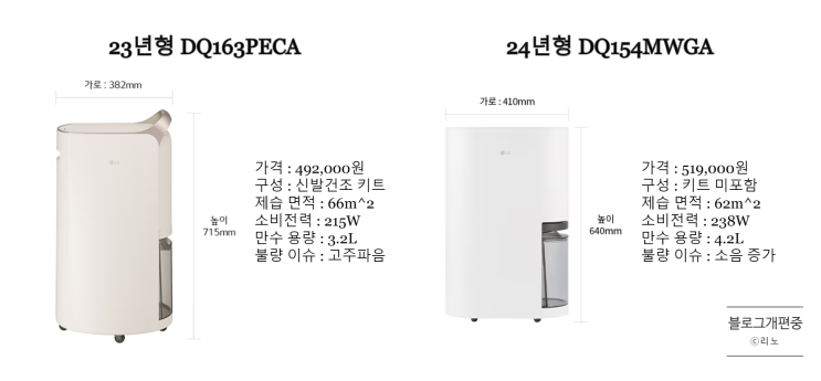 LG휘센 제습기 23년형 (DQ163PECA) vs 24년형 (DQ154MWGA) 전격 비교